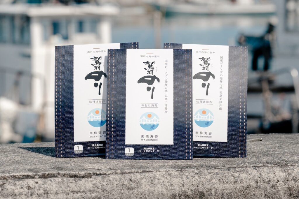国産ジーンズ発祥の地である倉敷市児島にちなんで、岡山県限定で販売するジーンズパッケージの味付け海苔。食べやすい個包装(6切12枚)です。